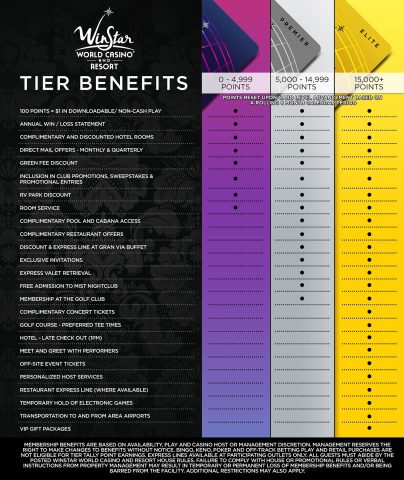 Tier points will be earned at participating electronic games at the rate of $10 per one tier point. Tier points for table games will be earned based on the game, average bet and duration of play.